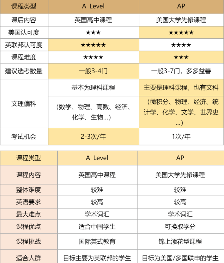 两个课程的难度相差不大。不过就单科难度而言,与A Level相比,AP的内容相对较少、难度相对较低,这是因为AP把科目拆分的更加细致。