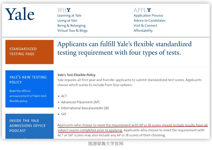 耶鲁大学则要求所有申请者提交标化成绩,并提供了多种考试选项。校方特别指出:如果学生选择以AP或IB成绩来满足申请要求,则必须提交在申请前完成的所有相关科目的考试成绩。